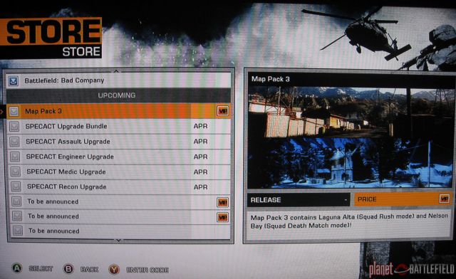 The in-game store for Battlefield: Bad Company 2 has been updated with details of Map Pack 3, which will be free for people who have entered in a VIP code. Map Pack 3 will contain Laguna Alta (Squad Rush), and Nelson Bay (Squad Death Match).